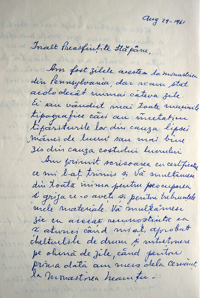 Regarding Your Reverence’s visit to America, I repeat that personally I would be overjoyed if you could manage to come, even if for a short visit, or if you would prefer to remain for a longer period and serve in a Romanian parish here. I wouldn’t want to tempt you too much, however, because priestly life here is inexpressibly difficult; true missionary sacrifice in the fullest sense of the word. With a strong will and with help from Divine Grace, even here one can attain spiritual fulfillment and blessedness in Christ.