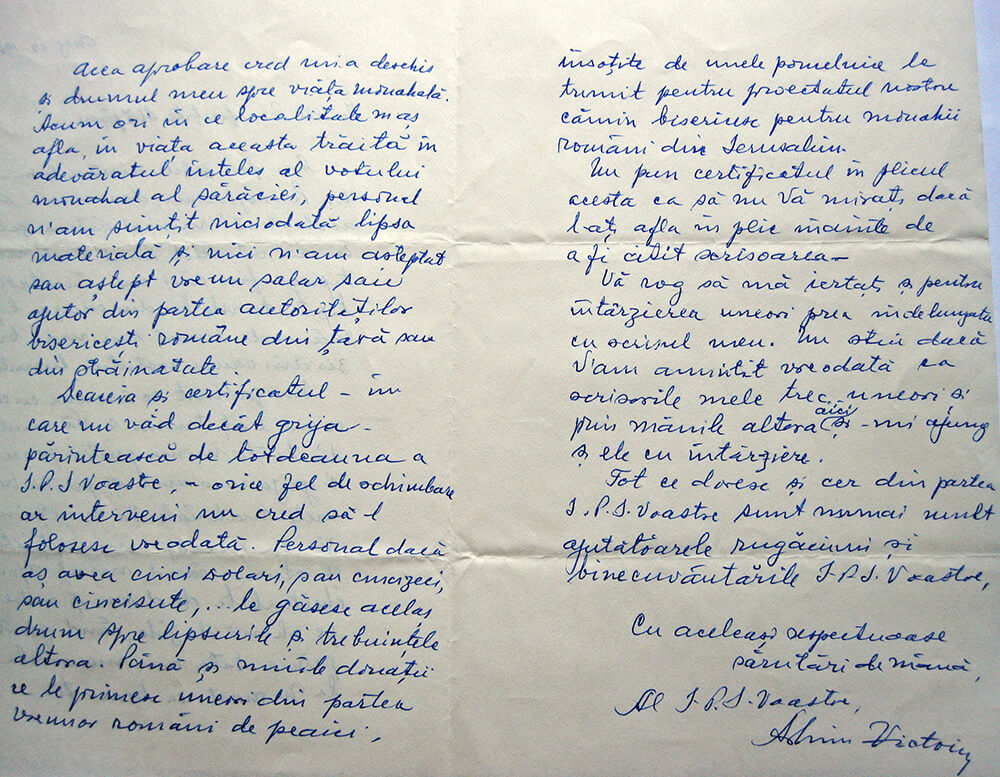 I received the letter with the certificate that you sent me and I thank You from all my heart for the care and attention that you have for my material needs. I thank you with the same gratitude as when you sponsored my travel and living expenses for one month, when I went for the first time from Cernăuți to Neamț Monastery.
