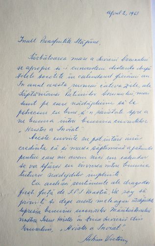 We conclude the publication of the letters addressed to Metropolitan Visarion Puiu – a correspondence which lasted from 1955 to 1963, and which aligned with one of the most difficult periods in the life of Archimandrite Victorin – with two letters from 1961. Afterwards, we present a letter from the first years of his hierarchical service, addressed to Father Ștefan Slevoacă, who later served as a priest in Canada for several years. These letters reveal the realism, but also the hope beyond hope, with which he eventually greeted the difficult pastoral conditions in America. Likewise, they show the delicacy, sensitivity, and gratefulness which he had toward those who supported him in his mission as monk, missionary priest, and later as bishop.