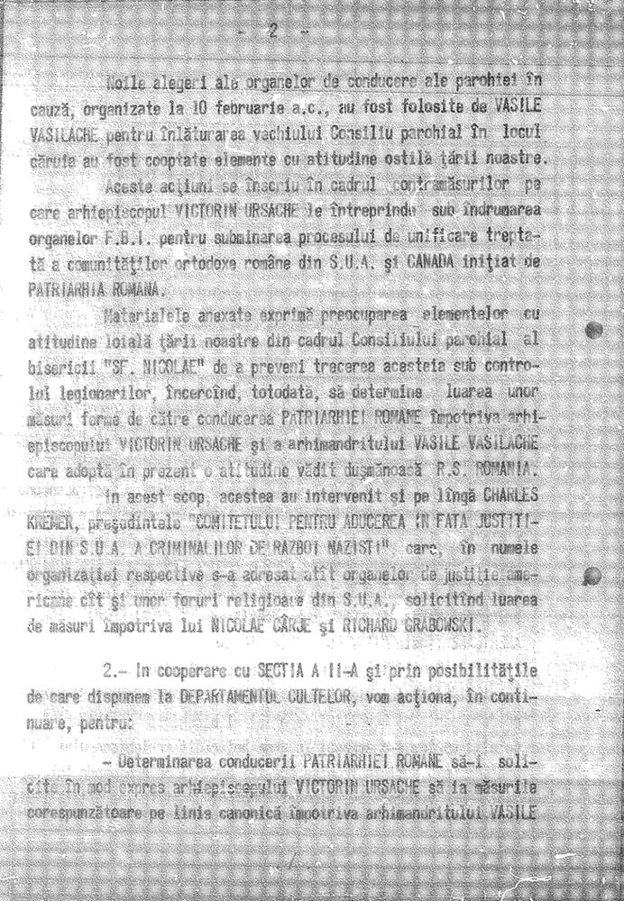 – Initiating, through means specific to our work, several combined actions directed at isolating VICTORIN URSACHE and VASILE VASILACHE from the Romanian Orthodox communities in U.S.A. and CANADA, and, ultimately, at removing them from their offices.