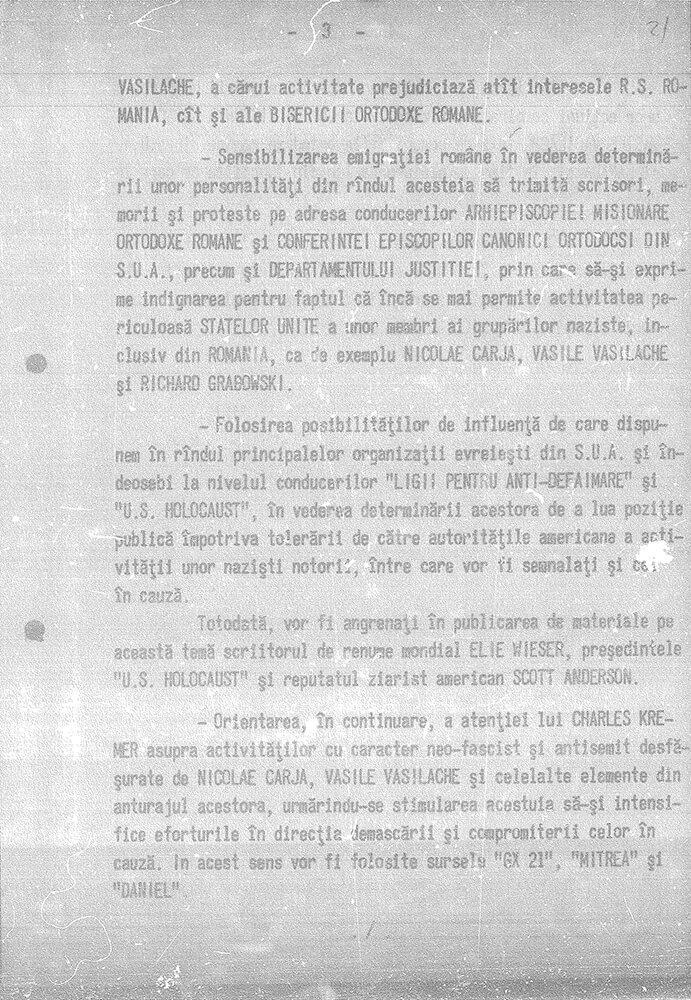 – Raising awareness among the Romanian diaspora to enjoin several persons from their midst to send letters, memoirs, and protests against the leadership of the ROMANIAN ORTHODOX MISSIONARY ARCHDIOCESE and the CONFERENCE OF CANONICAL ORTHODOX BISHOPS IN U.S.A., as well as of the JUSTICE DEPARTMENT, through which they express their indignation that the UNITED STATES still permits the dangerous behavior of several members of Nazi groups, including those from ROMANIA, for example NICOLAE CARJA, VASILE VASILACHE, and RICHARD GRABOWSKI.