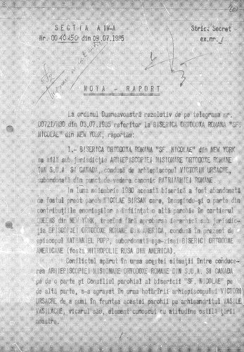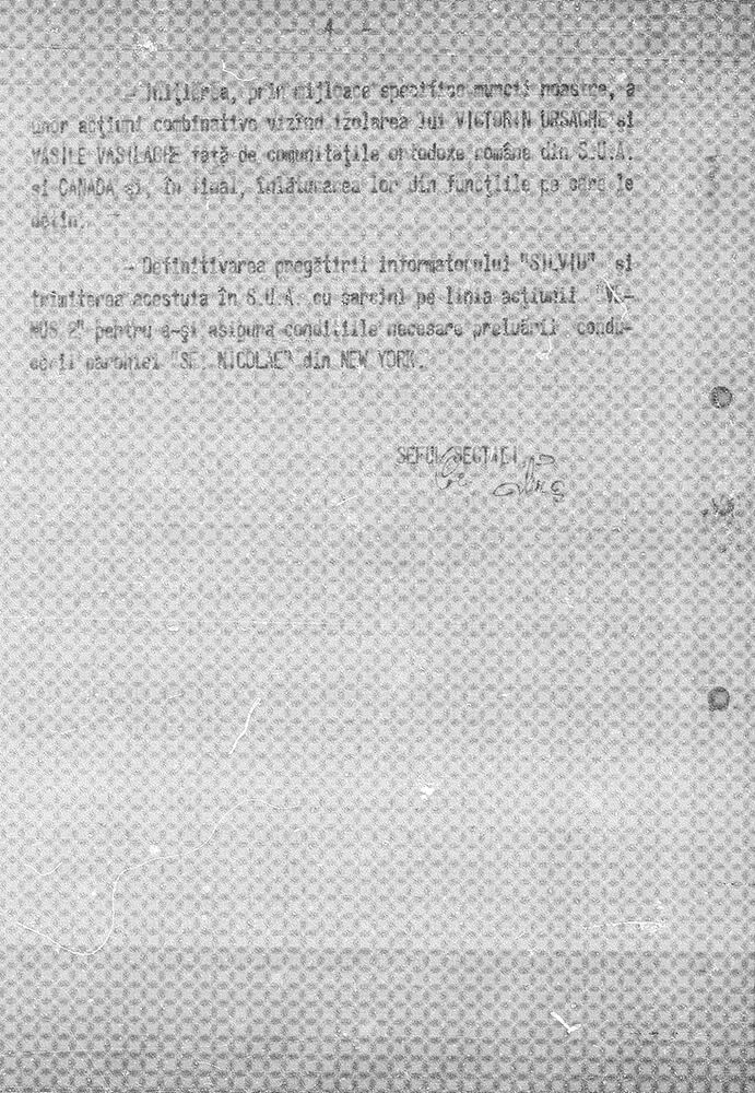– Finalizing the training of the informer “SILVIU” and sending him to U.S.A. with directives from the “VENUS 2” operation to create the necessary conditions that he may assume leadership of “ST. NICHOLAS” parish in NEW YORK.