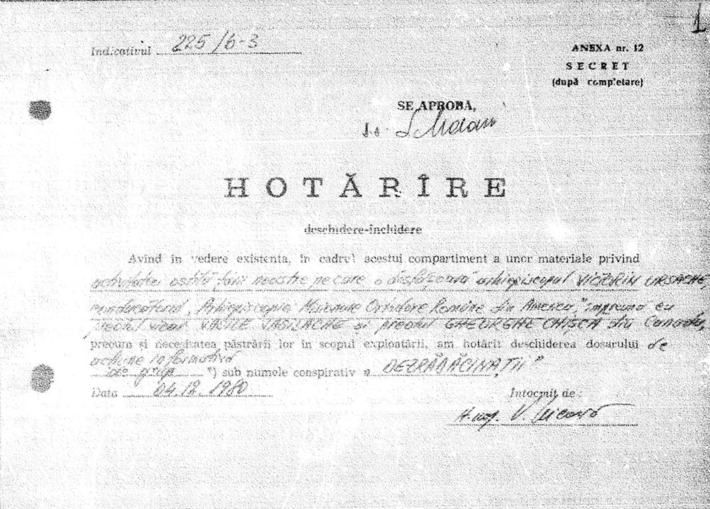 We conclude our presentation of the documentary witnesses about Archbishop Victorin by jumping forward to the ninth decade of the previous century. This decade marked the culmination of pressure exerted by the communist authorities at Bucharest upon the gentle bishop, because the latter refused to yield to the former’s attempts to interfere. Therefore, on December 4, 1980, the Secret Service opens “the file of group informative action under the conspirative name Uprooted”, against Archbishop Victorin and his closest collaborators (we are publishing the photograph of this decision). And to have an idea about what the Secret Service could do to destabilize and what methods it used through its external services, we are publishing the transcription and photocopy of a document from July 9, 1985, from this file.